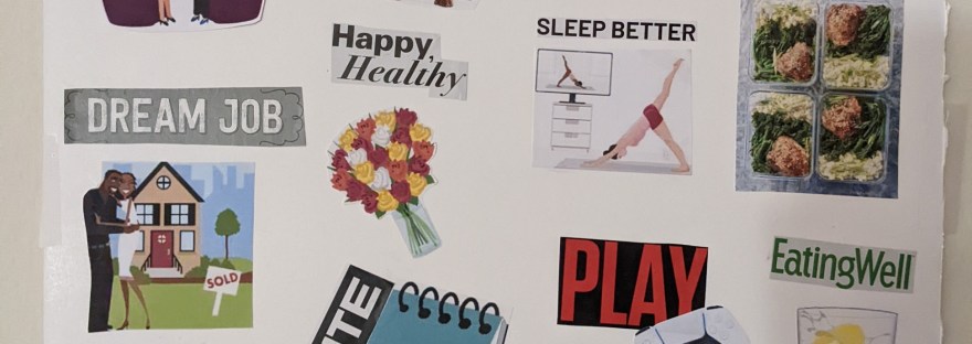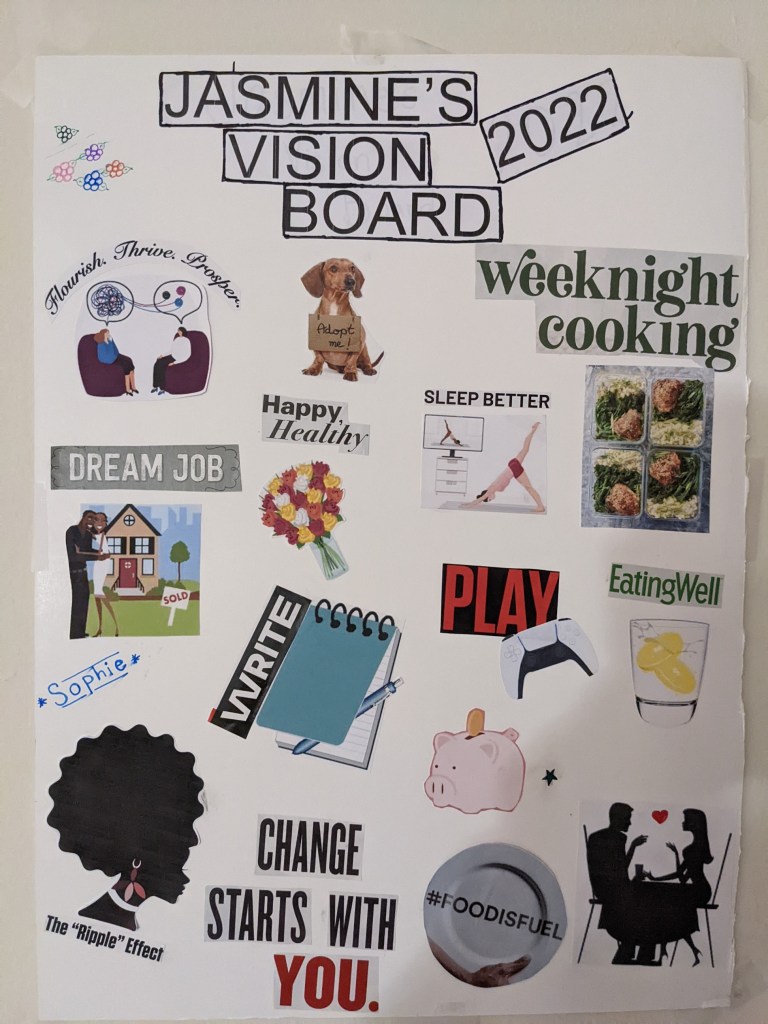 Y’all already know how important mental, physical, and emotional wellness are to me, so I want to keep those values at the forefront of my vision board. I have images of a woman talking and working things through with a therapist, a glass of lemon water (my latest and greatest obsession), a woman doing yoga in front of a TV, and some meal prep containers full of nutritious and delicious-looking food. I also have phrases posted like, “Happy, healthy”, “Sleep Better”, and “#FoodIsFuel”. I plan to cook more, sleep more, invite more peace and positivity in my life, and just be happier.