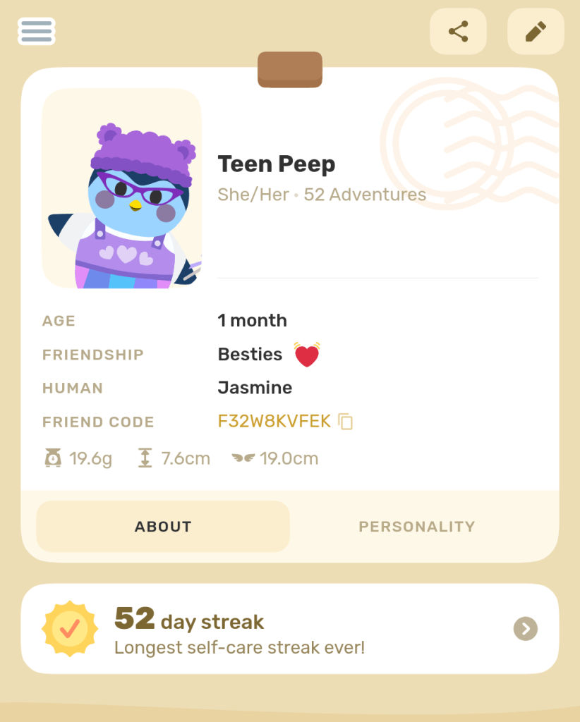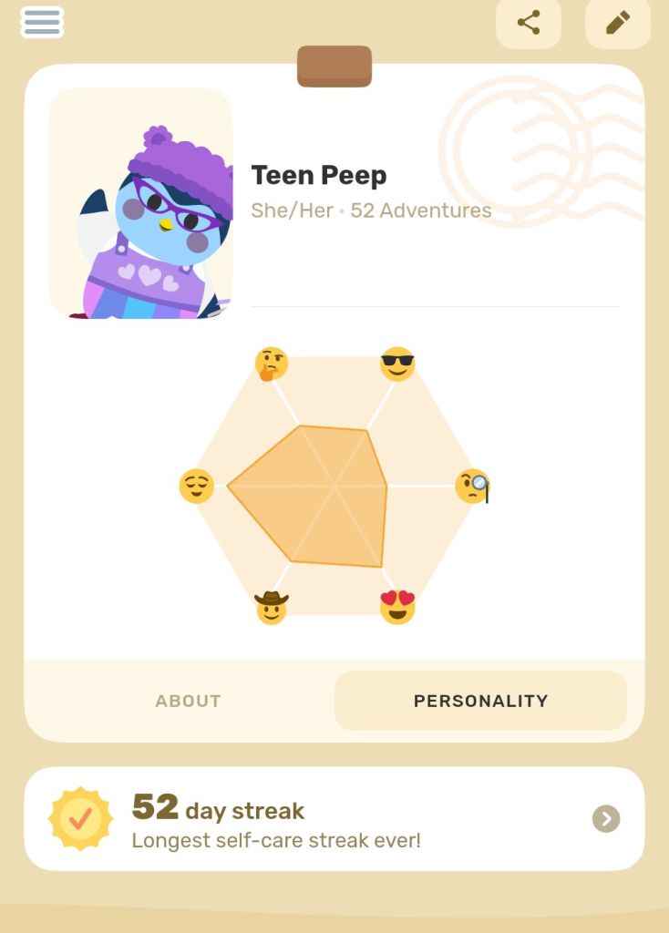 I saw an ad for the app “Finch,” and it was described as, “The Duolingo for your mental health.” Obviously, I had to try it, so on December 30, 2024, I downloaded the app and have been on a 52-day self-care streak ever since. To sum it up quickly, you take care of a virtual pet by taking care of your mental health. You can set goals for yourself and as you complete them, you’re caring for and nurturing your little pet too.